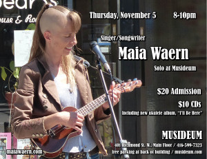 Void of cutlery but lush with personality Musideum is a true listening room! Maia Waern at MUSIDEUM Thursday, November 5 -- 8-10pm $20 admission $10 albums Solo concert with guitar, ukuleles & thumb piano Featuring all original songs about mostly happy things Seating is very limited -- reserve your tickets today!