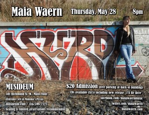 Poster photo, above, by Danny Marks Performance photo, below, by Faizal Sheriff, photographic01.com Maia Waern’s Musideum performance will feature songs from her new solo album, I’ll Be Here, due to be released in May 2015. Maia's new tracks feature 9 songs on ukulele (and a thumb piano lullaby) about the reassurance that comes from hope, love, and gratitude. Also, as well as sharing unrecorded originals, Maia will be performing selections from her debut album, From Now On; including Train Tracks,…