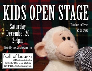 The next Kids Open Stage at Full of Beans Coffee House & Roastery is on SATURDAY, December 20, 2014
